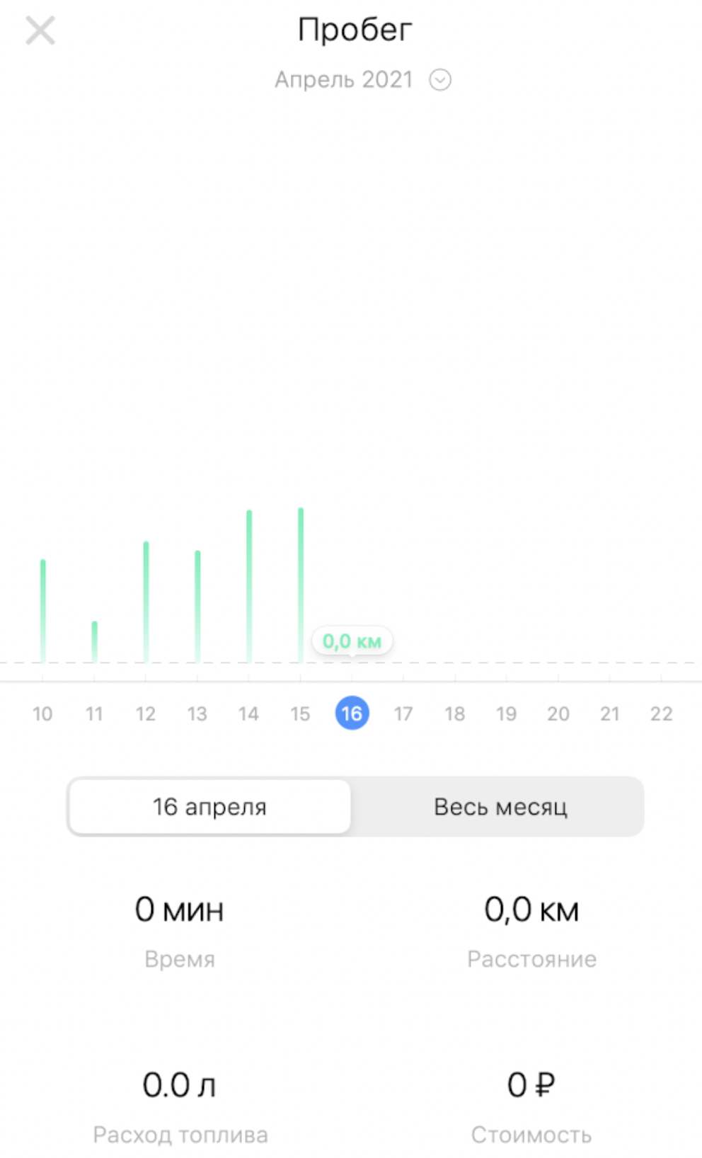 При нажатии на график на экране статистики открывается график с детальной информацией, который отображает статистику по пробегу за выбранный период.