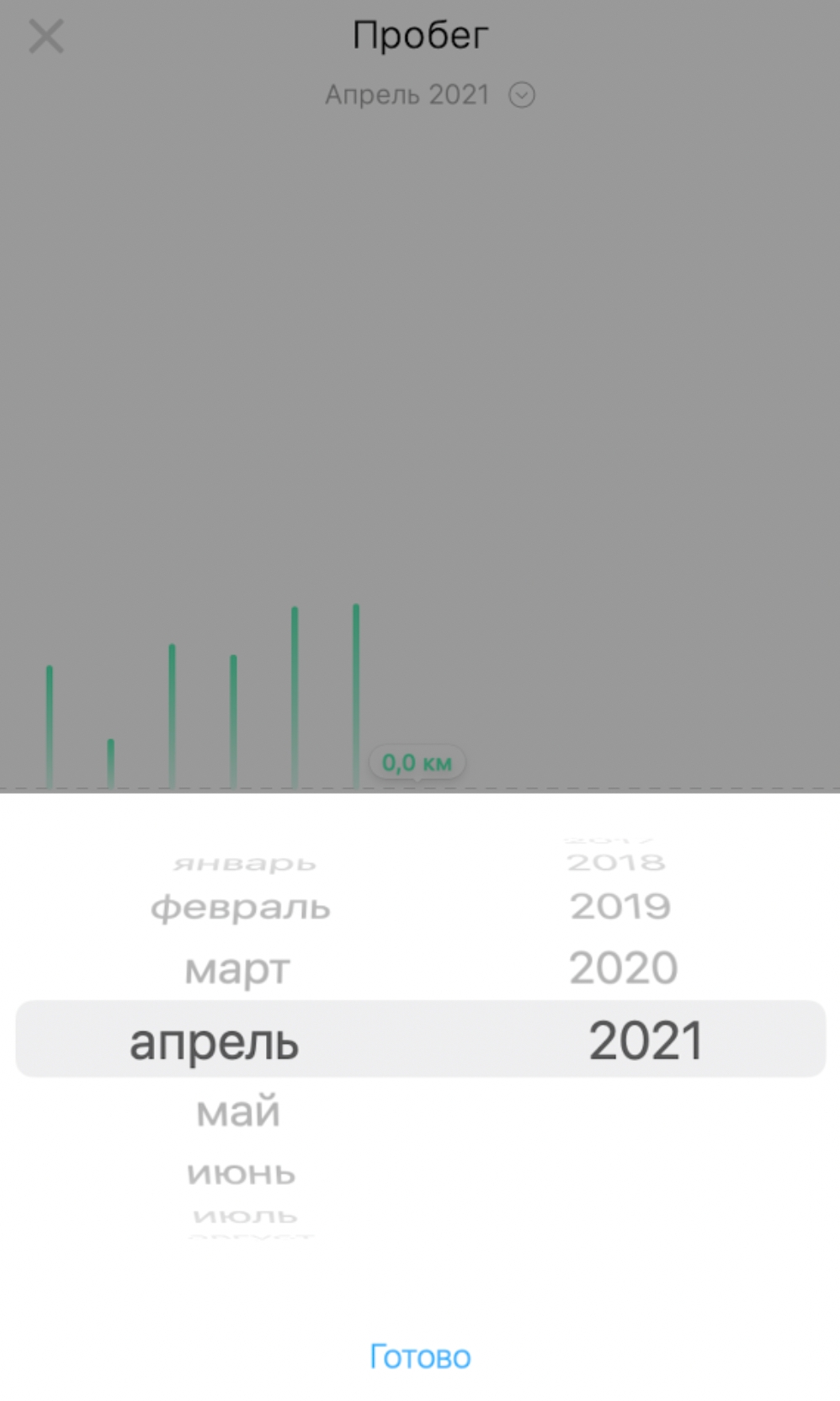 При детальном просмотре в приложении вы можете выбрать месяц, для которого необходимо отобразить статистику. Для этого нажмите на название указанного месяца и в приложении отобразится список месяцев, для которого можно просмотреть статистику по пробегу.