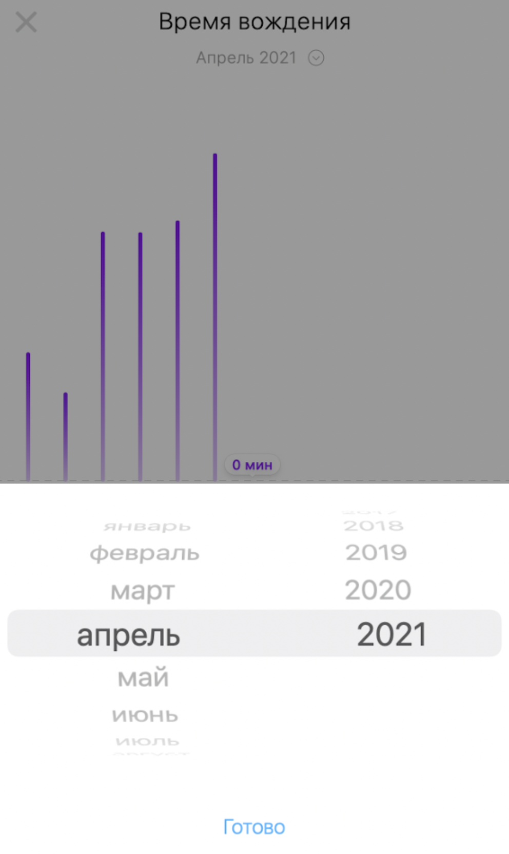При детальном просмотре в приложении вы можете выбрать месяц, для которого необходимо отобразить статистику. Для этого нажмите на название указанного месяца и в приложении отобразится список месяцев, для которого можно просмотреть статистику по времени вождения.